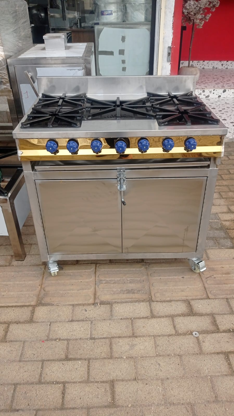 - ضاعف إنتاجية مطبخك التجاري مع فرن ومركب غاز الجمرة المتكامل. تصميم عملي يجمع بين موقد علوي بـ 5 عيون غاز قوية للطبخ السريع، وفرن سفلي واسع ومثالي لعمليات الخبز، التسخين، والتحمير. تم تصنيع هذا الهيكل بالكامل من الستانلس ستيل المقاوم للصدأ لضمان أقصى درجات المتانة وتحمل ضغط العمل في المطاعم والمطابخ الكبيرة. كما أنه مزود بعجلات (كفرات) سفلية متينة لتسهيل نقله وتحريكه أثناء تنظيف المطبخ.